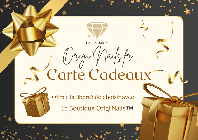 Vous cherchez une idée cadeau unique et personnalisée ? Offrez la liberté de choisir avec nos cartes cadeaux Origi’Nails™️, idéales pour les amateurs de manucure ! Nos cartes cadeaux, disponibles en plusieurs valeurs (10 €, 25 €, 50 €, 100 € et 150 €), permettent d’accéder à une gamme de produits et kits de manucure professionnels, press-on nails, décorations et accessoires tendance. Une manière parfaite de faire plaisir, pour les anniversaires, fêtes ou simplement pour gâter vos proches !