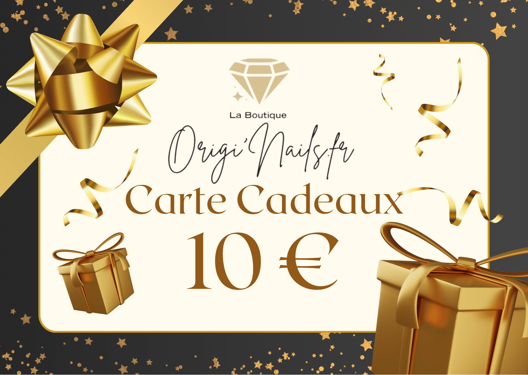 Vous cherchez une idée cadeau unique et personnalisée ? Offrez la liberté de choisir avec nos cartes cadeaux Origi’Nails™️, idéales pour les amateurs de manucure ! Nos cartes cadeaux, disponibles en plusieurs valeurs (10 €, 25 €, 50 €, 100 € et 150 €), permettent d’accéder à une gamme de produits et kits de manucure professionnels, press-on nails, décorations et accessoires tendance. Une manière parfaite de faire plaisir, pour les anniversaires, fêtes ou simplement pour gâter vos proches !